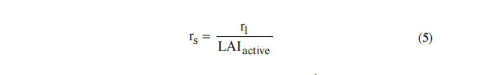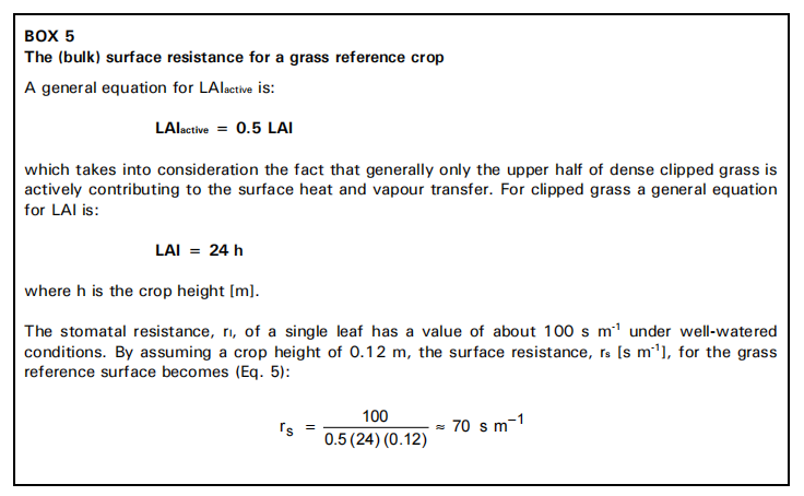 其中 ra 空气动力阻力 [s m-1], zm 测风高度 [m], zh 湿度测量高度 [m], d 零平面位移高度 [m], zom 控制动量传递的粗糙度长度 [m], zoh 控制热量和蒸汽传递的粗糙度长度 [m], k von Karman 常数,0.41 [-], uz 高度 z [m s-1] 处的风速。 该方程仅适用于中性稳定条件,即温度、大气压力和风速分布遵循近似绝热条件(无热交换)。在短时间内(每小时或更短时间)应用该方程式可能需要包括稳定性修正。然而,在预测含水良好的参考表面中的ETo时,热交换很小,因此通常不需要进行稳定性校正。 许多研究探索了植物冠层中风的性质。当表面被植被覆盖时,必须考虑零位移高度和粗糙度长度。这些因素取决于作物高度和结构。已经开发了几个用于估计d、zom和zoh的经验公式。Box 4 中给出了草基准面的空气动力阻力推导。 (Bulk) surface resistance (rs) (整体)表面阻力(rs) “整体”表面阻力描述了蒸汽流经蒸腾作物和蒸发土壤表面的阻力。如果植被没有完全覆盖土壤,阻力系数实际上应该包括土壤表面蒸发的影响。如果作物没有以潜在速率蒸腾,那么阻力也取决于植被的水分状况。对于茂密的全覆盖植被表面阻力的更复杂关系,可接受的近似值为: