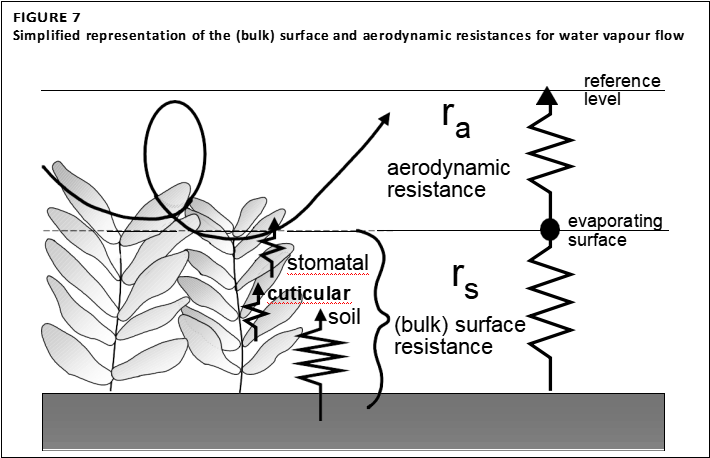 FIGURE 7 Simplified representation of the (bulk) surface and aerodynamic resistances for water vapour flow 图7 水蒸气流在(体积)表面和空气动力中阻力的简化表示法 组合公式的 Penman-Monteith 形式为: