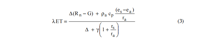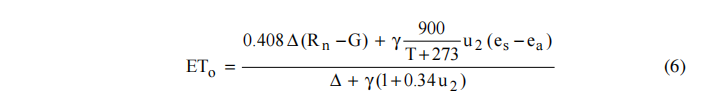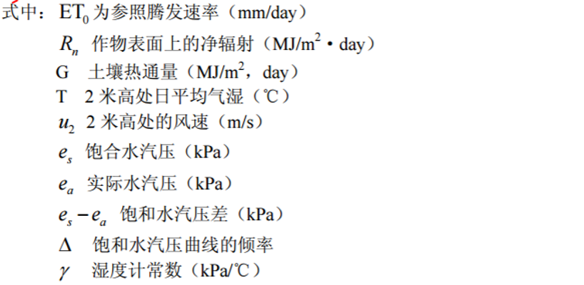REFERENCE SURFACE 参考作物种植的表面 为了避免出现每种作物和生长阶段都定义独特的蒸发参数,引入了参考作物种植表面的概念。各种作物的蒸散率通过作物系数与参考面的蒸散率(ETo)相关。 过去,已提出开放水面作为参考表面。然而,空气动力学、植被控制和辐射特性的差异对将 ET 与自由水蒸发的测量联系起来提出了很大的挑战。将 ETo 与特定作物联系起来的优点是结合了来自作物表面的 ET 所涉及的生物和物理过程。 草与紫花苜蓿一起,是一种经过充分研究的作物,就其空气动力学和表面特性而言,是全球公认的参考表面。因为对蒸汽扩散的阻力很大程度上取决于作物高度、地被、LAI 和土壤水分条件,所以参考作物的特征应该得到很好的定义和固定。 作物高度的变化导致粗糙度和 LAI 的变化。因此,相关的顶篷和空气动力阻力将随时间显着变化。此外,水分胁迫和地被覆盖程度对阻力和反照率都有影响。 为了避免需要苛刻和昂贵研究的局部校准问题,选择了假设的草参考作物。活草参考的困难是由于草的种类和形态会显着影响蒸发速率,尤其是在用水高峰期。暖季和冷季草类型之间可能存在很大差异。冷季草的气孔控制程度较低,因此蒸散率较高。在一些干旱的热带气候中,可能很难种植冷季草。 粮农组织关于修订粮农组织作物需水方法的专家磋商会接受了以下对参考面的明确定义: “假设的参考作物,假定作物高度为 0.12 m,固定表面阻力为 70 s m-1,反照率为 0.23。” 参考表面非常类似于高度均匀的绿草的宽阔表面,生长活跃,完全遮蔽地面并有足够的水。草表面应该是广泛和均匀的要求源于所有通量都是一维向上的假设。 选择粮农组织 Penman-Monteith 方法作为可以明确确定该参考面 (ETo) 蒸散量的方法,并作为在所有区域和气候中提供一致 ETo 值的方法。 FAO PENMAN-MONTEITH EQUATION,粮农组织 PENMAN-MONTEITH 方程 Equation 公式 1990 年 5 月,粮农组织与国际灌溉和排水委员会以及世界气象组织合作,组织了一次专家和研究人员磋商会,以审查粮农组织关于作物需水量的方法,并就程序的修订和更新提出建议。