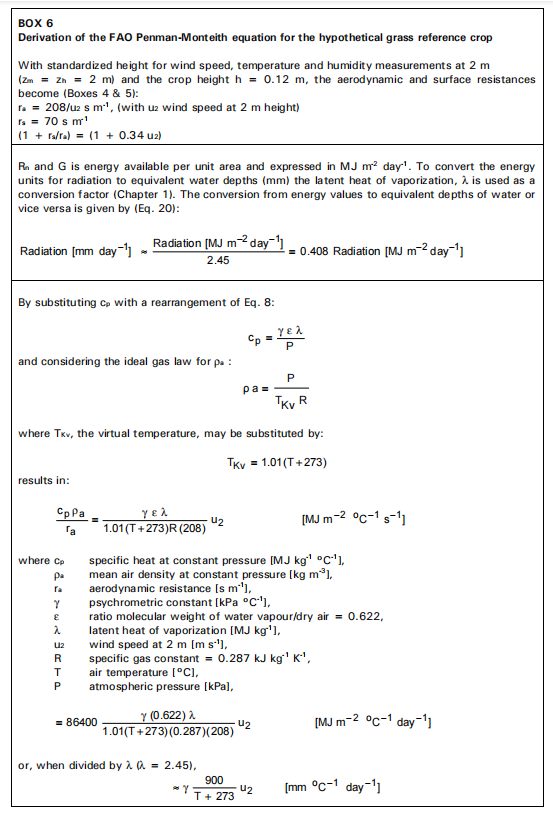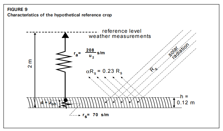图 9 假定参考作物的特征 专家小组建议采用 Penman-Monteith 组合方法作为参考蒸散量的新标准,并就各种参数的计算程序提出建议。 通过将参考作物定义为假设高度为 0.12 m、表面阻力为 70 s m-1 和反照率为 0.23 的假设作物,非常类似于高度均匀的绿草延伸表面的蒸发,积极生长和 充分浇水后,开发了粮农组织 Penman-Monteith 方法。 该方法克服了以前的粮农组织 Penman 方法的缺点,并提供了更符合全球实际作物用水数据的值。 由原始的 Penman-Monteith 公式(公式 3)和空气动力学方程(公式 4)和表面阻力方程(公式 5)可以推导出估算 ETo 的 FAO Penman-Monteith 方法(Box 6)。