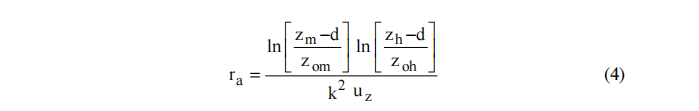 式中 Rn 为净辐射,G 为土壤热通量,(es - ea) 表示空气的蒸汽压亏缺,ρa为恒压下的平均空气密度,cp 为空气的比热,∆表示饱和蒸汽压温度关系的斜率,γ 是湿度常数,rs 和 ra 是(体积)表面和空气动力阻力。方程的参数在第 3 章中定义。 上面公式化的 Penman-Monteith 方法包括控制能量交换的所有参数和来自均匀植被的相应潜热通量(蒸散)。大多数参数是测量的,或者可以很容易地从天气数据中计算出来。该公式可用于直接计算任何作物的蒸散,因为表面和空气动力阻力是作物特定的。 Aerodynamic resistance (ra) 空气动力阻力 (ra) 热量和水蒸气从蒸发表面转移到冠层上方的空气中是由空气动力阻力决定的: