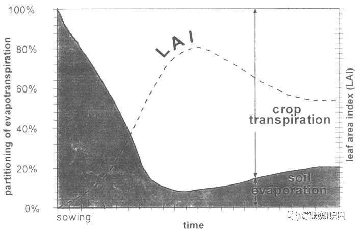 第1章:蒸发腾发量简介发表时间:2022-06-09 08:36 Chapter 1 - Introduction to evapotranspiration本章解释了参考作物蒸发腾发量(ETo)和标准条件下的作物蒸发腾发量(ETc)以及各种管理和环境条件(ETc adj)的概念以及两者之间的差异。它还研究了影响蒸发腾发量的因素、蒸发腾发量的正常表达单位以及确定蒸发腾发量的方式。 EVAPOTRANSPIRATION PROCESS 蒸发腾发过程 水分一方面通过蒸发从土壤表面流失,另一方面通过蒸腾从作物中流失的两个独立过程的组合称为蒸散量(ET)。 译者注:ET 在农业水利行业也叫蒸发腾发量。在气象等专业叫作蒸散量。实际上都是从英文单词: Evapotranspiration 译来, 以下无必要说明的,两者可能会混用。 Evaporation 蒸发蒸发是将液态水转化为水蒸汽(蒸发)并从蒸发表面上散去(蒸汽去除)的过程。水从各种表面蒸发,如湖泊、河流、路面、土壤和潮湿植被表面。 ![]() FIGURE 1. Schematic representation of a stoma 图1. 气孔的示意图 ![]() FIGURE 2. The partitioning of evapotranspiration into evaporation and transpiration over the growing period for an annual field crop 图2. 对一年生大田作物而言,在生长期间将蒸散分为蒸发和蒸腾 Transpiration 蒸腾蒸腾作用包括植物组织中所含液态水的蒸发和蒸汽进入大气。作物主要通过气孔失水。这些是植物叶片上的小气孔,气体和水蒸气通过这些气孔开口散失的(图1)。水分和一些营养物质被根系吸收并通过植物茎叶运输。蒸发发生在叶片内部,即细胞间空隙间,与大气的蒸汽交换由气孔孔径开口控制。几乎所有被吸收的水分都会因蒸腾作用而流失,只有一小部分被用于植物器官内部。 Evapotranspiration (ET) 蒸散量(ET)蒸发和蒸腾同时发生,没有简单的方法来区分这两个过程。除了表层土壤中的水分可利用性外,种植土壤的蒸发主要取决于到达土壤表面的太阳辐射的比例。随着作物的生长和作物冠层遮住越来越多的土地面积,这一比例在生长期间会减少。当作物较小时,水分主要通过土壤蒸发流失,但一旦作物发育良好并完全覆盖土壤,蒸腾作用就成为主要过程。在图2中,蒸发蒸腾分为蒸发和蒸腾,其对应于其下方是每单位土壤表面的叶面积。在播种时,近100%的ET来自蒸发,而在全作物覆盖时,超过90%的ET来自蒸腾。 Units 单位蒸散量通常以单位时间的毫米(mm)表示。该速率以水深为单位表示单位面积的表面损失的水量。时间单位可以是一小时、一天、十年、一个月,甚至是整个生长期或一年。 TABLE 1. Conversion factors for evapotranspiration 表1. 蒸散量换算系数